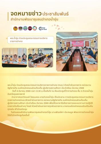 จ่าอากาศเอกวิทมนต์ ไชยมงคล นายอำเภอน้ำขุ่น เป็นประธาน การประชุมคณะกรรมการบริหารราชการอำเภอ(กบอ.)หัวหน้าส่วนราชการ หน่วยงานรัฐวิสาหกิจ องค์กรปกครองส่วนท้องถิ่น ผู้บริหารสถานศึกษา ประจำเดือน มีนาคม 2569 เพื่อปรึกษาหารือข้อราชการและแนวทางการปฏิบัติราชการในเรื่องต่างๆ โดยมี หัวหน้าส่วนราชการทุกส่วนราชการ นายกองค์กรปกครองส่วนท้องถิ่นทุกแห่ง เข้าร่วมประชุม