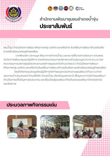 นางพัณณิตา ประถมมูล พัฒนาการอำเภอน้ำขุ่น มอบหมายให้นางสาวผ่องนภา แก่นเพชร นักวิชาการพัฒนาชุมชนปฏิบัติการ ร่วมกับคณะกรรมการบริหารงานตำบลแบบบูรณาการ (ก.บ.ต.) และคณะกรรมการบริหารศูนย์ประสานงานองค์การชุมชนระดับตำบล (ศอช.ต.) ดำเนินโครงการพัฒนาศักยภาพกลุ่ม องค์กร และเครือข่ายขับเคลื่อนการพัฒนาตำบลเข้มแข็งตามหลักปรัชญาเศรษฐกิจพอเพียง